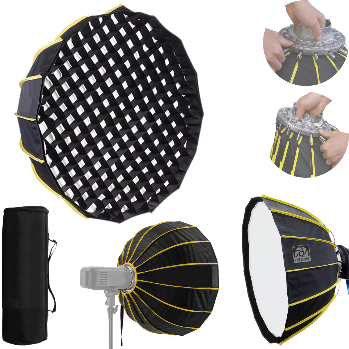 Softbox Parabólico 60CM DOBRÁVEL com encaixe BOWENS e montagem RÁPIDA com colmeia GRID para Flash Estúdio e Luz contínua de estúdio.